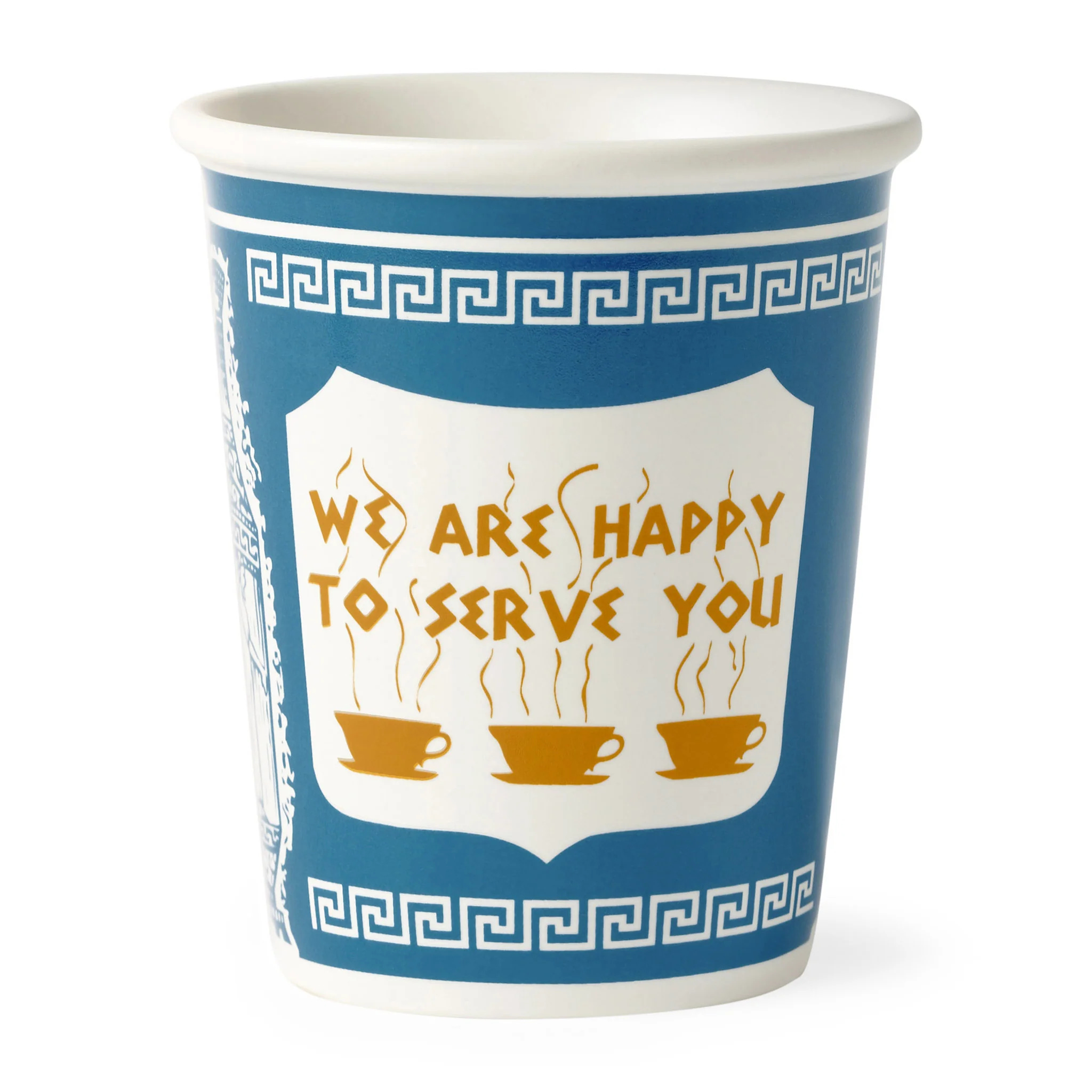 The blue-and-white âWe Are Happy To Serve Youâ cup, but in ceramic. Itâs nostalgia you can actually reuse. Morning coffee becomes a New York moment, even if youâre in sweatpants. Cozy is ritual, and this one feels like a wink to city life.
